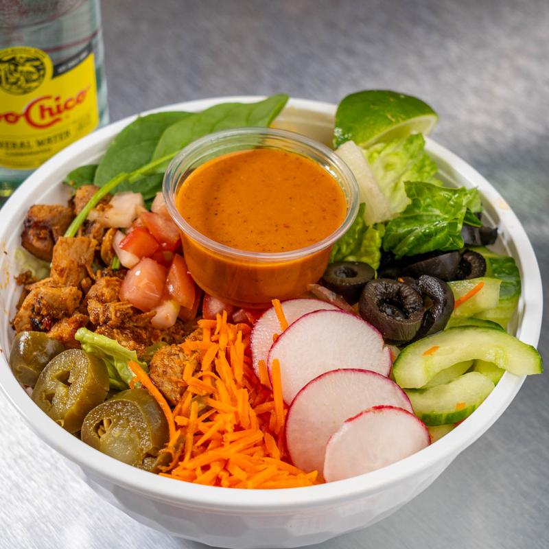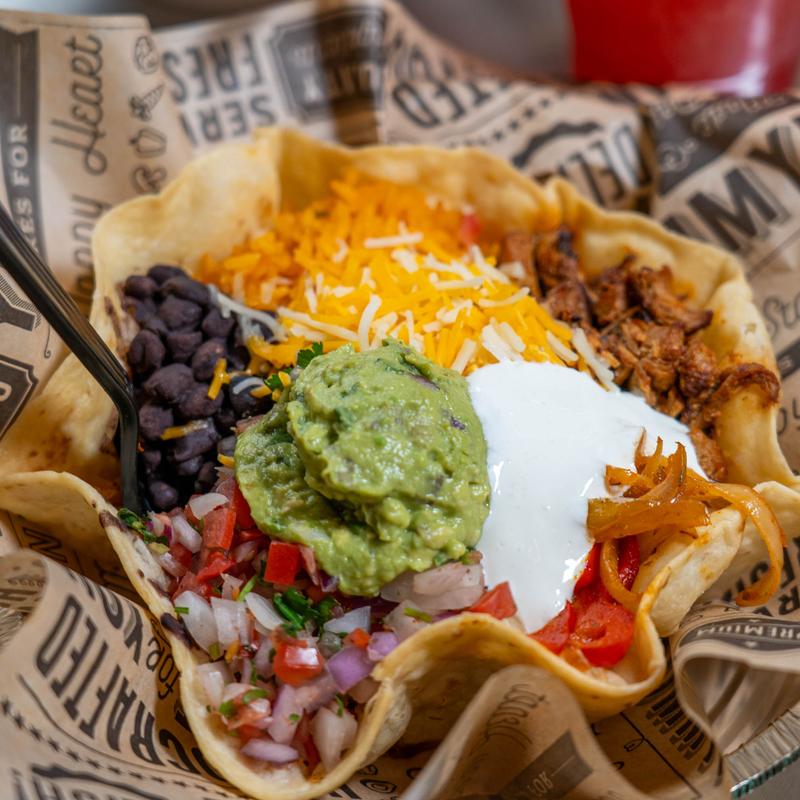 Fried flour tortilla into a bowl | Our build recommendation is with romaine lettuce, rice, beans, protein choice, fajita veggies, pico de gallo, crema Fresca, fancy shredded cheese, salsa level of choice & guac