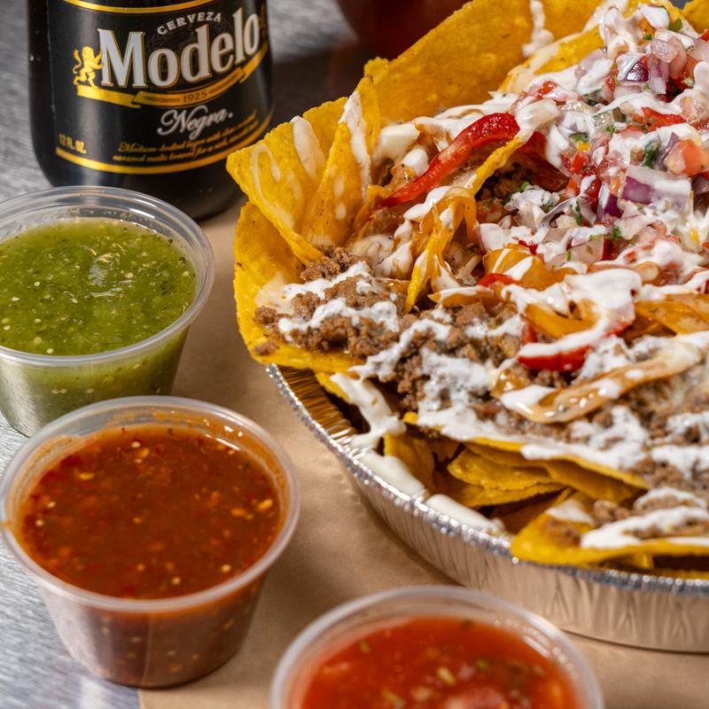 Our recommendation for your build is homemade crispy corn tortilla chips, rice & beans, choice of meat, choice of fajita veggies, melted white queso, pico de gallo, pickled jalapeno, crema fresca, and iceberg lettuce
