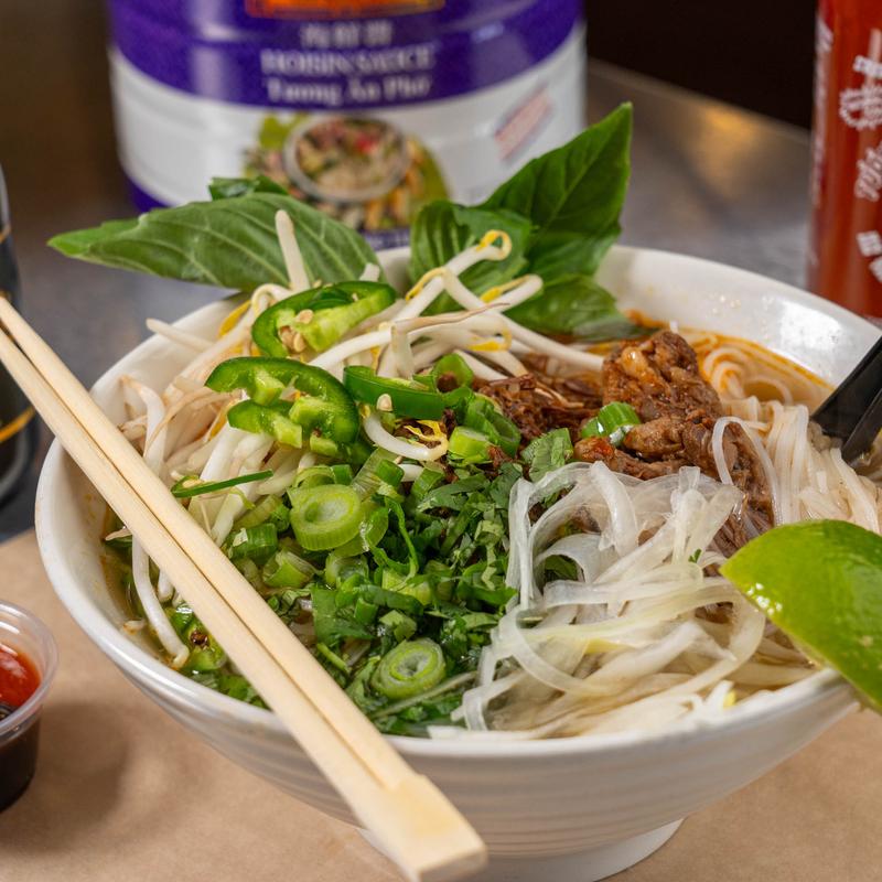The authentic Vietnamese soup with GF white rice noodles, protein choice, cilantro, scallions, white onions, fresh jalapenos, Thai basil, bean sprouts, fresh lime, and pick your broth. Hoisin and siracha sauce on the side