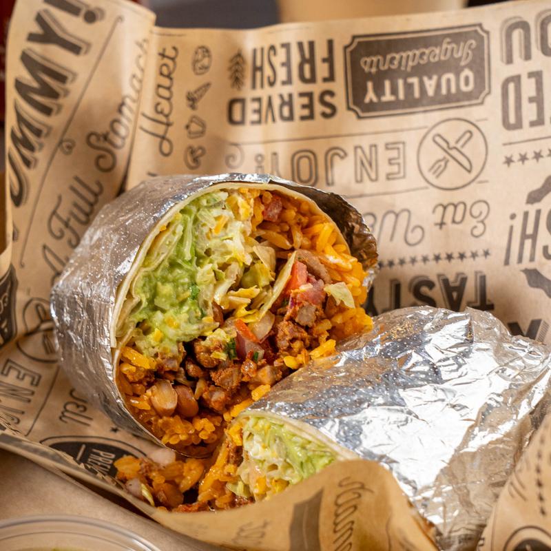 Mexican-style burrito in a 12" flour tortilla | Our recommendation for your build is with Spanish rice, pinto beans, protein choice, pico de gallo, crema fresca cheese, iceberg lettuce, your salsa level choice, and guac!